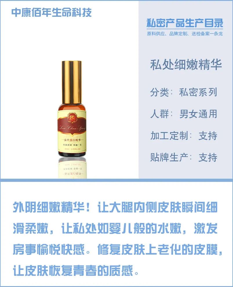 产品:私密细嫩修复精华 特性:本品对大肠杆菌、金黄色葡萄球菌、白色念珠菌有较高的抑菌作用,在使用时能有效防止细菌感染 规格:展示样品为30ml(可根据定制需求做成各种包装) 使用方法:取适量轻柔于皮肤即可。